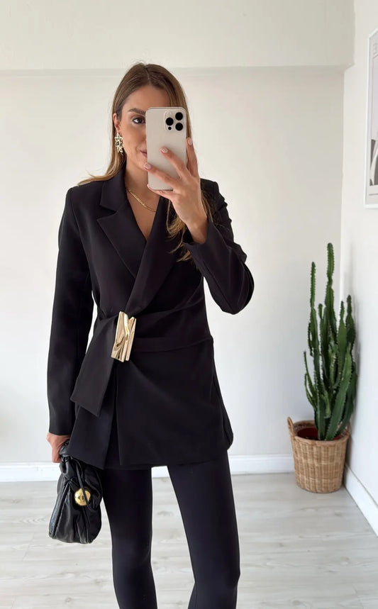 fitted waist a golden buckle detail double-breasted blazer front fastening with a hidden snap button and tie - black