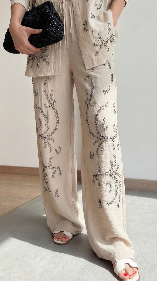 Beige Embellished with sewn rhinestones Relaxed Co-Ord Set