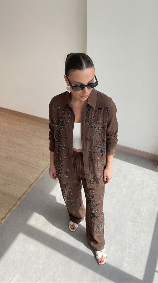 Brown Embellished with sewn rhinestones Relaxed Co-Ord Set