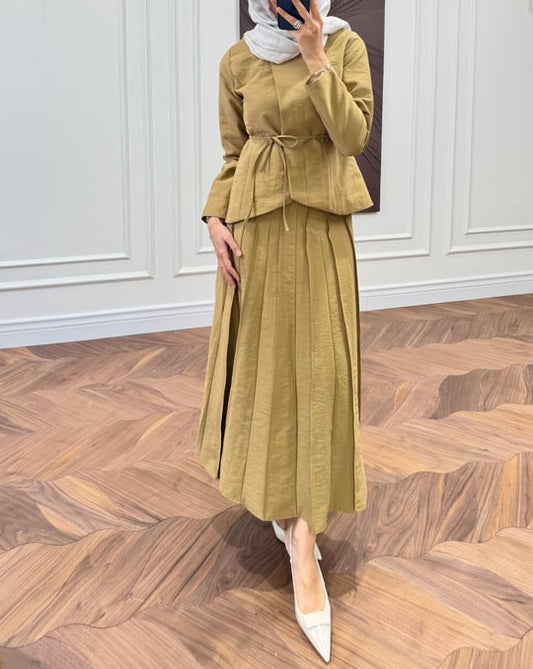 Arna Brooch Detail Pleated Skirt Set Mustard