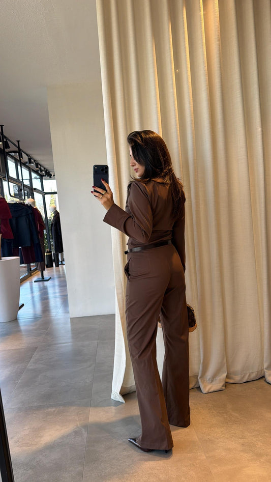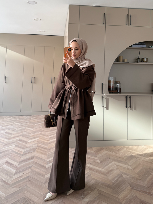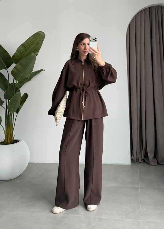 Cobra fabric jacket with a drawstring waist with straight leg trousers co-ord set- brown