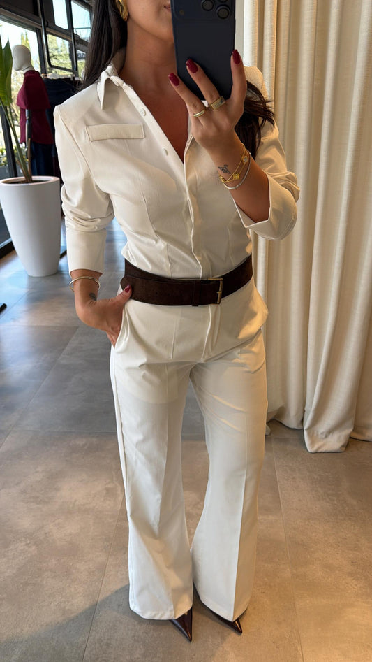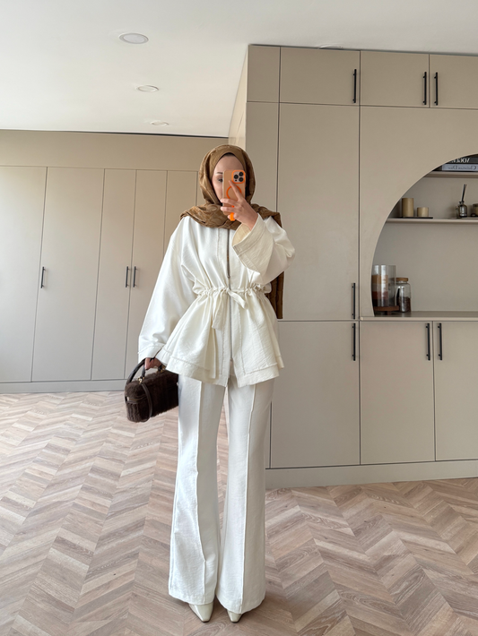 Cobra fabric jacket with a drawstring waist with straight leg trousers co-ord set- pearl white