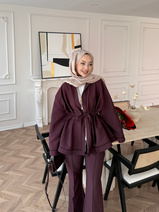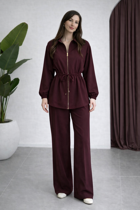 Cobra fabric jacket with a drawstring waist with straight leg trousers co-ord set- burgundy