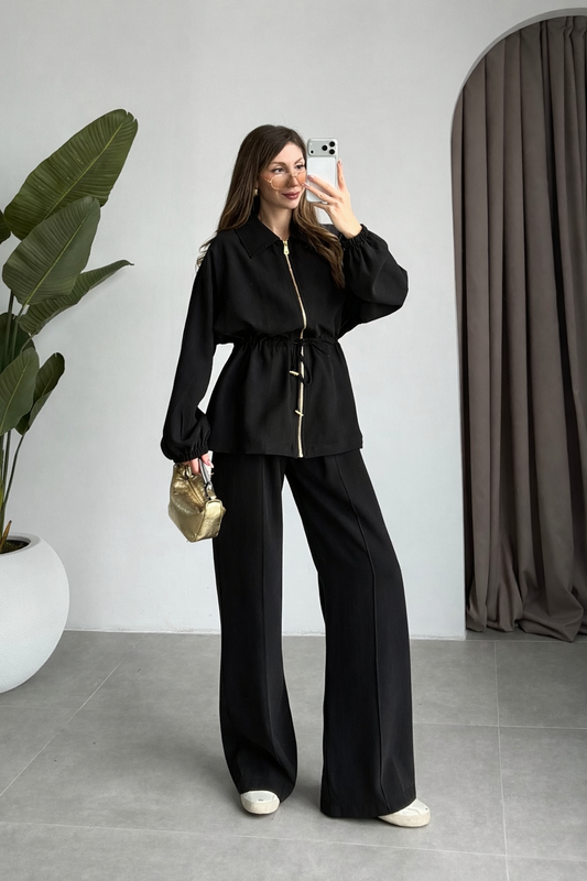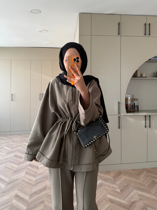 Cobra fabric jacket with a drawstring waist with straight leg trousers co-ord set- khaki