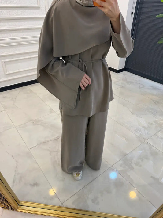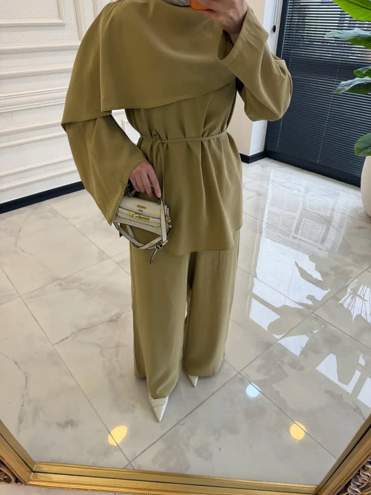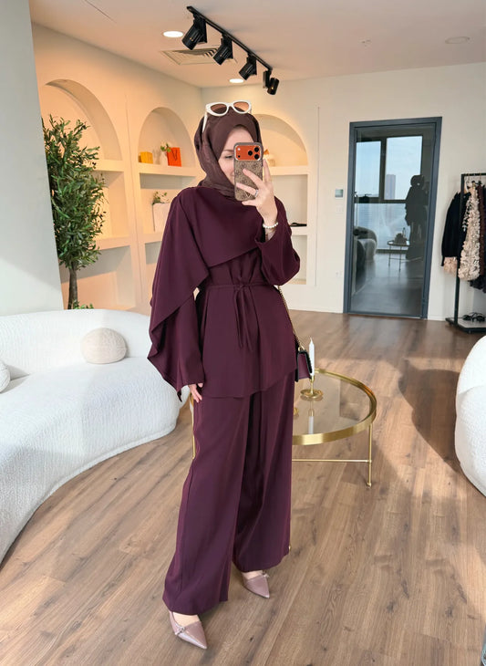 layered wrap cape-style overlay and a waist tie with wide-leg pants co-ord set