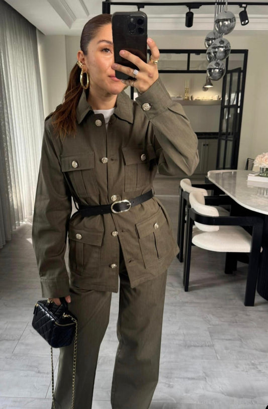 Gold Buttoned Belted Suit