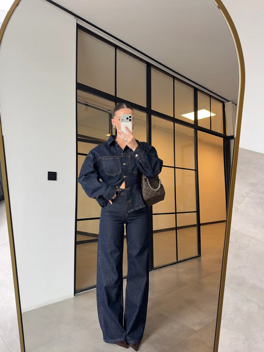 fitted pleated denim jacket with straight-leg trouser co-ord set