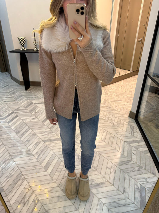 Beige fur-trimmed double-zipper cardigan