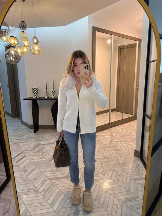 Off-white fur-trimmed double-zipper cardigan