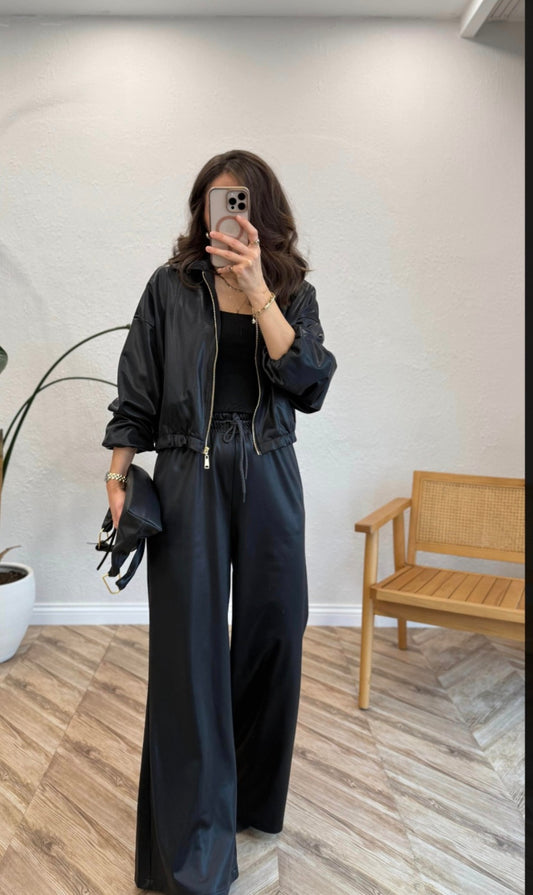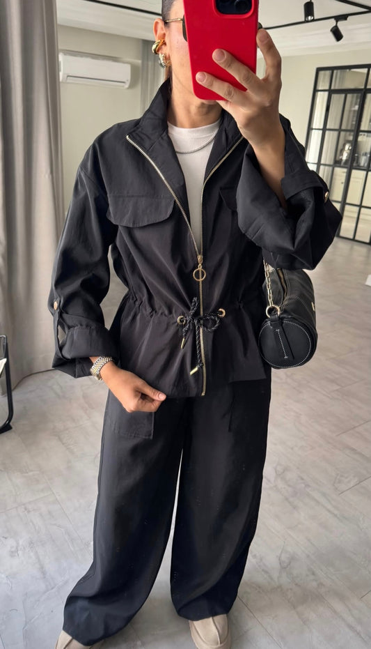 Safari jacket with drawstring High-waisted pants with a wide elastic Two-Piece Set (black)