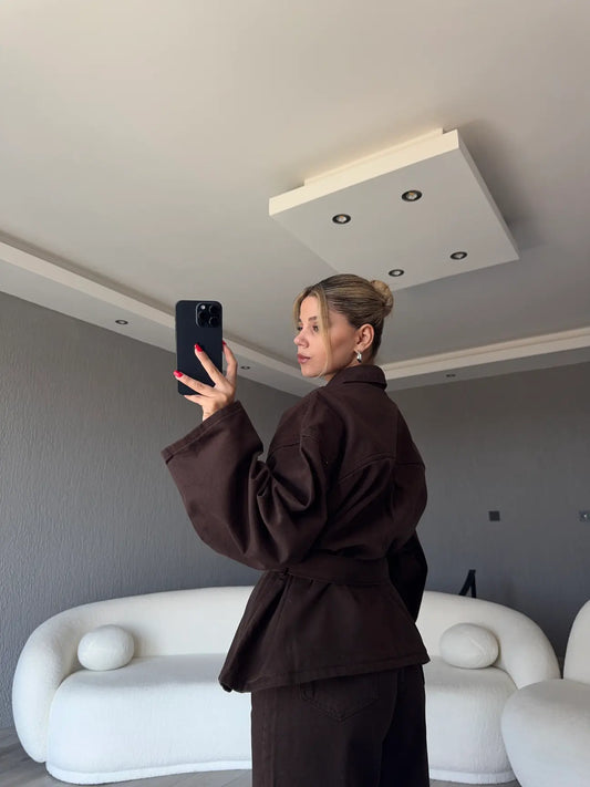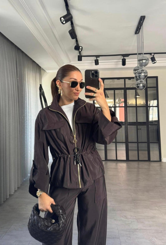 Safari jacket with drawstring High-waisted pants with a wide elastic Two-Piece Set (brown)