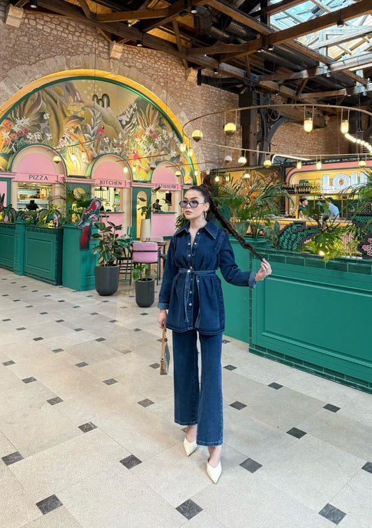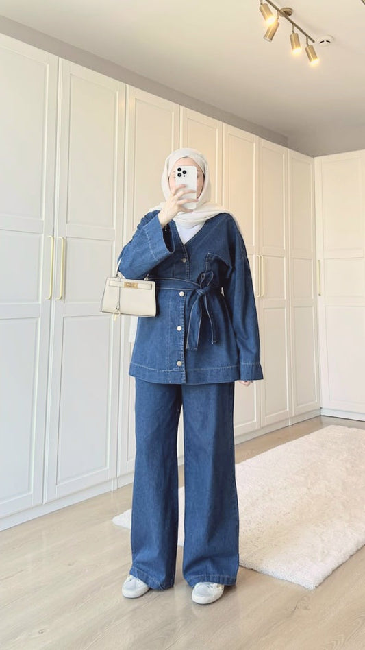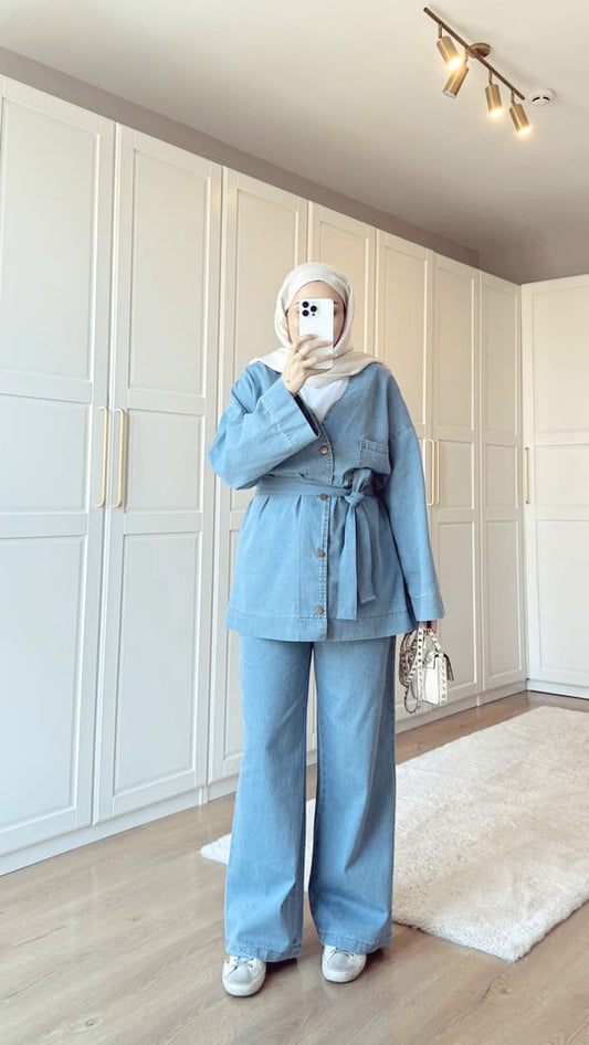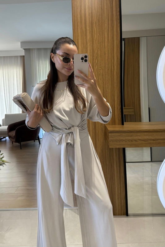 Oysho fabric Two-Piece blouse with belt tie at waist,wide Leg trouser