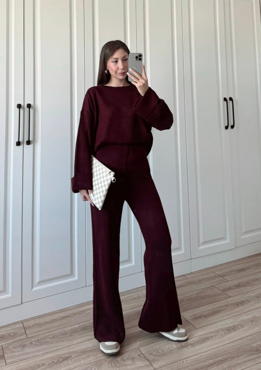 Burgundy collar V-Neck Knitwear Suit