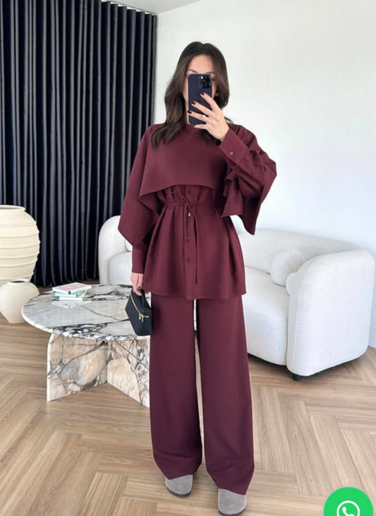 shirt with Cape,waistband Pants co-ord set - burgundy