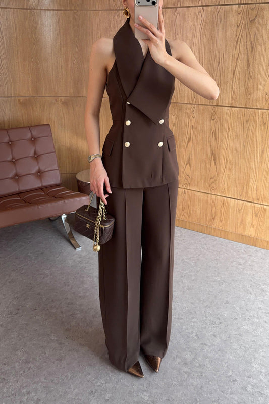 shirt with Cape,waistband Pants co-ord set - brown