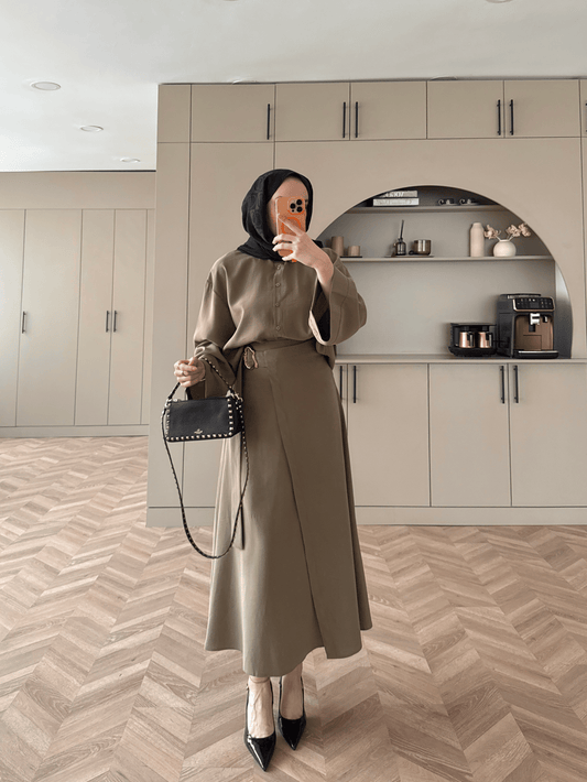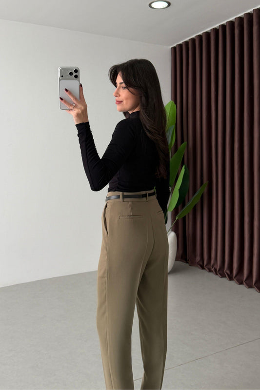 Mora Khaki Crepe Fabric Belted Carrot Pants