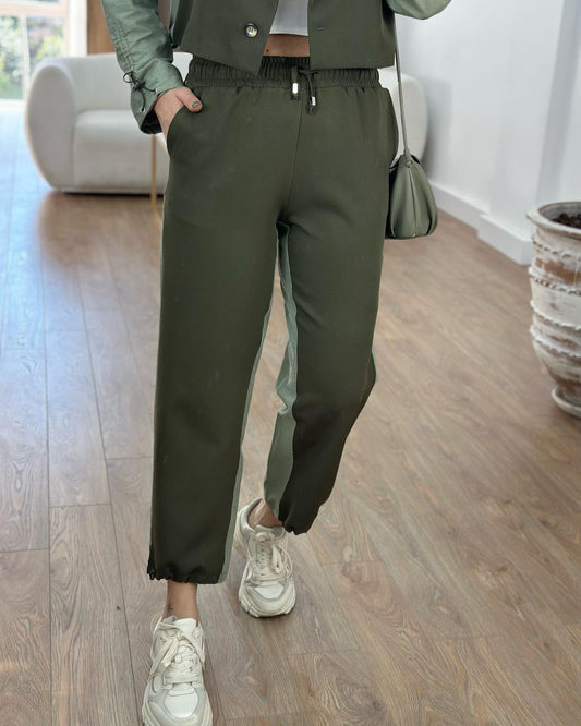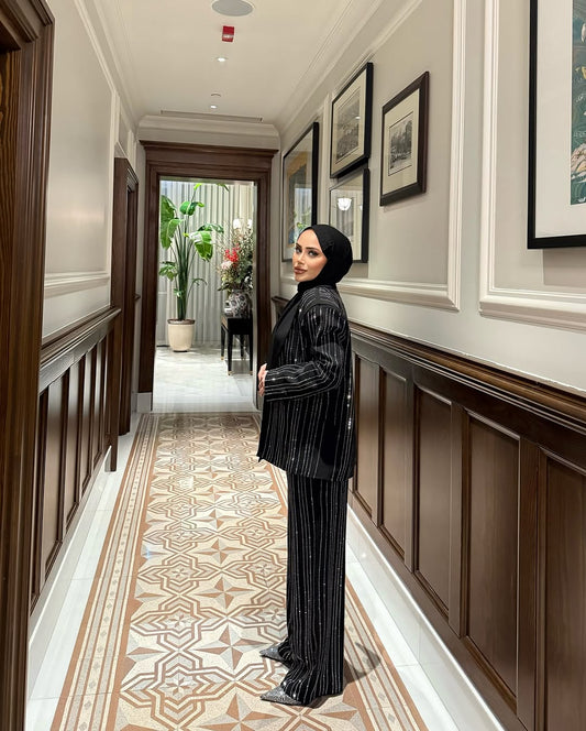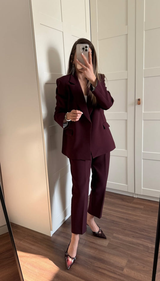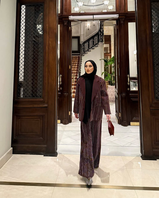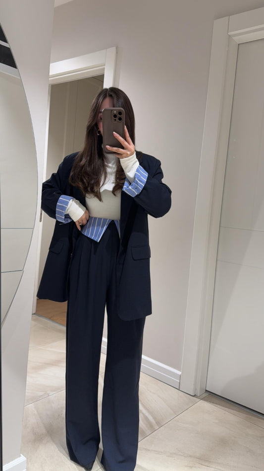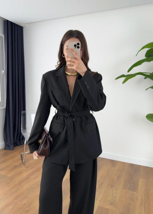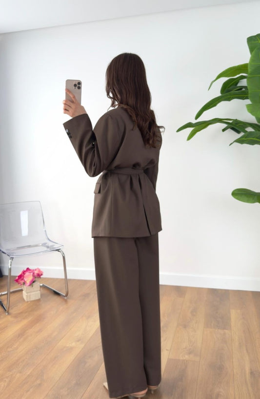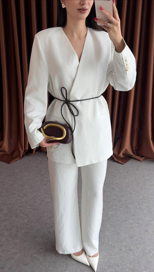 Striped blazer with a soft leather belt, wide trouser co-ord suit