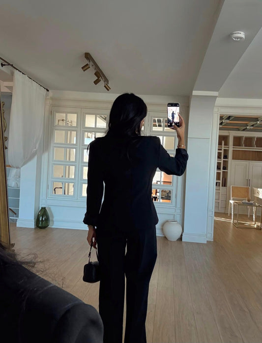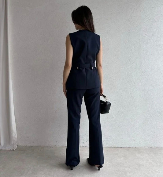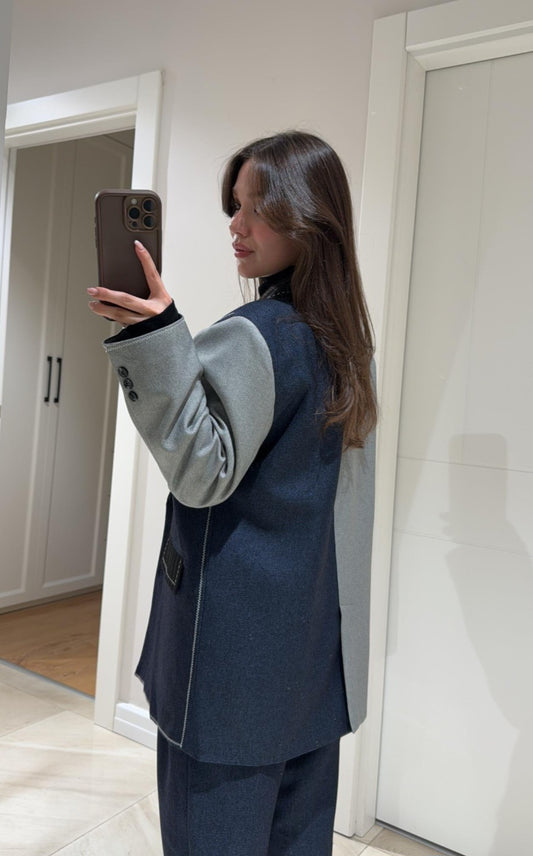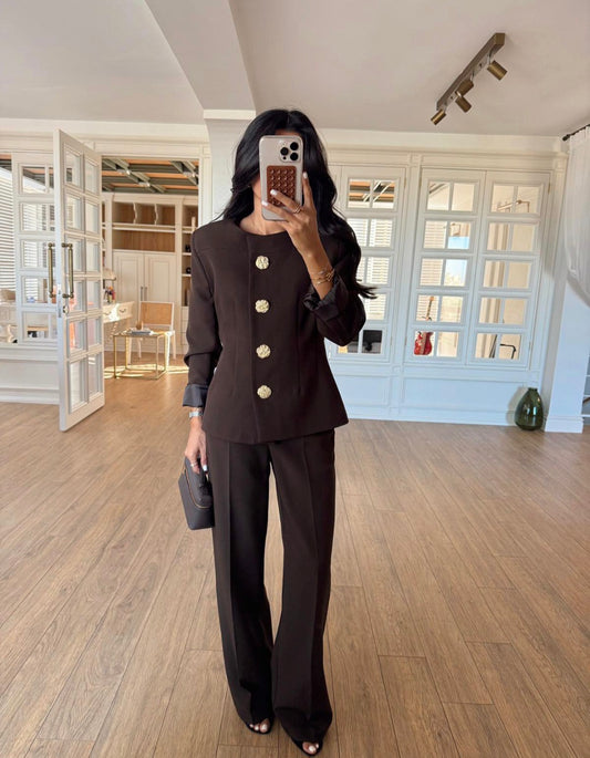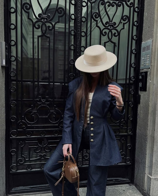 Denim suit with golden buttons ,Featuring pleats at the waist