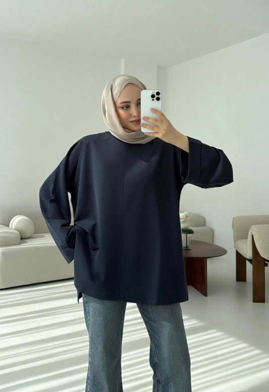 Belted Wide sleeve sweatshirt with side slit (navy blue)