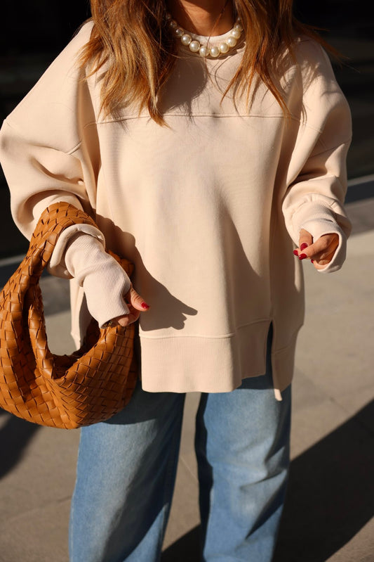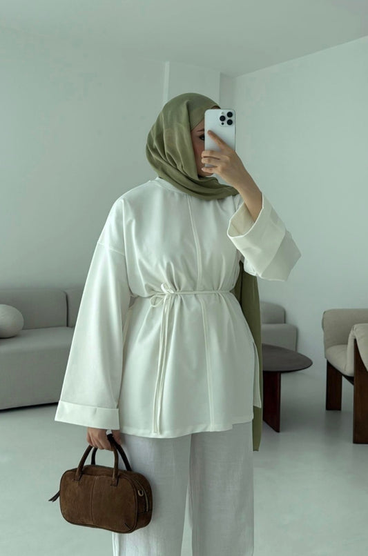 Belted Wide sleeve sweatshirt with side slit (off-white)