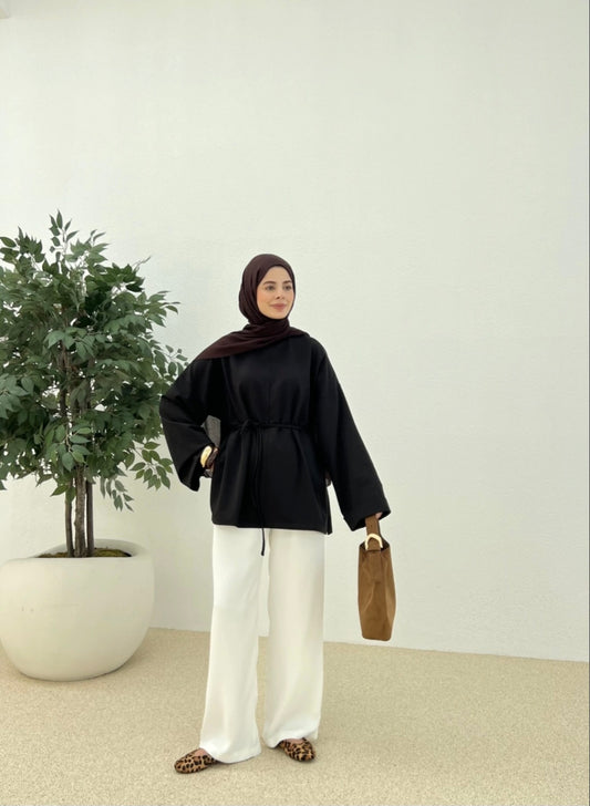 Belted Wide sleeve sweatshirt with side slit (black)