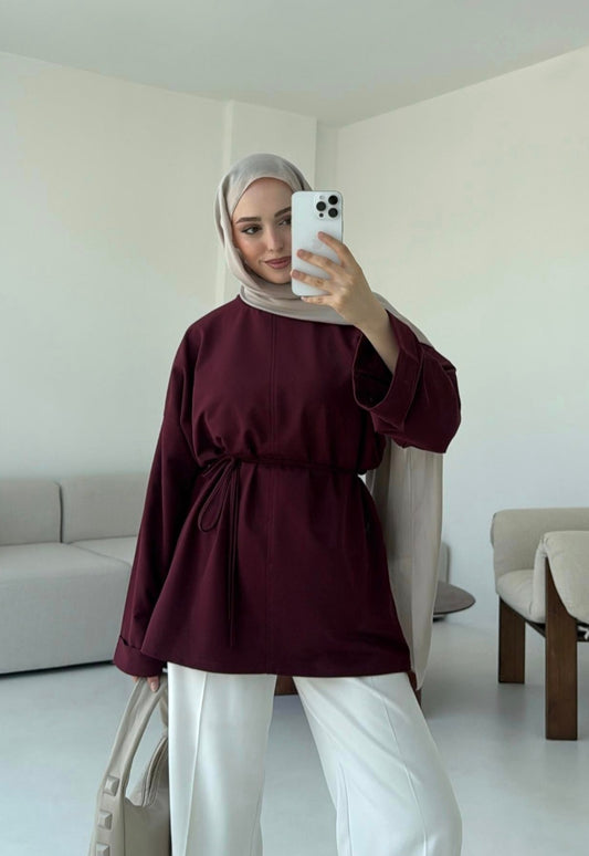 Belted Wide sleeve sweatshirt with side slit (burgundy)