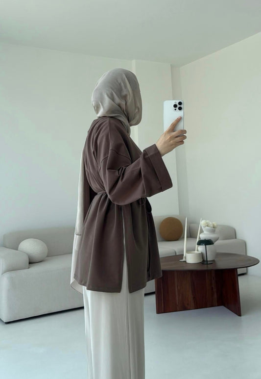 Belted Wide sleeve sweatshirt with side slit (brwon)