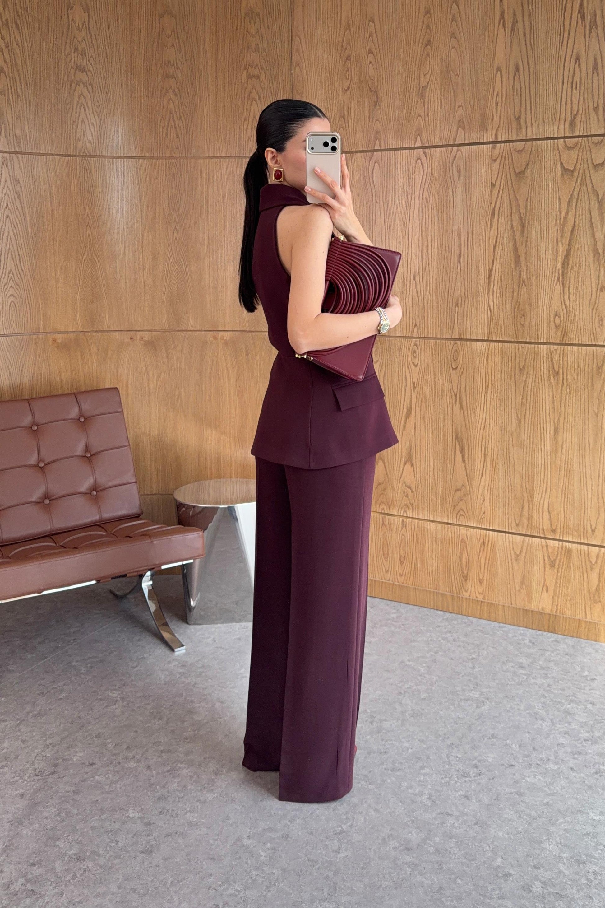 Plum Asymmetric Collar Gold Buttoned Vest and Trousers Set